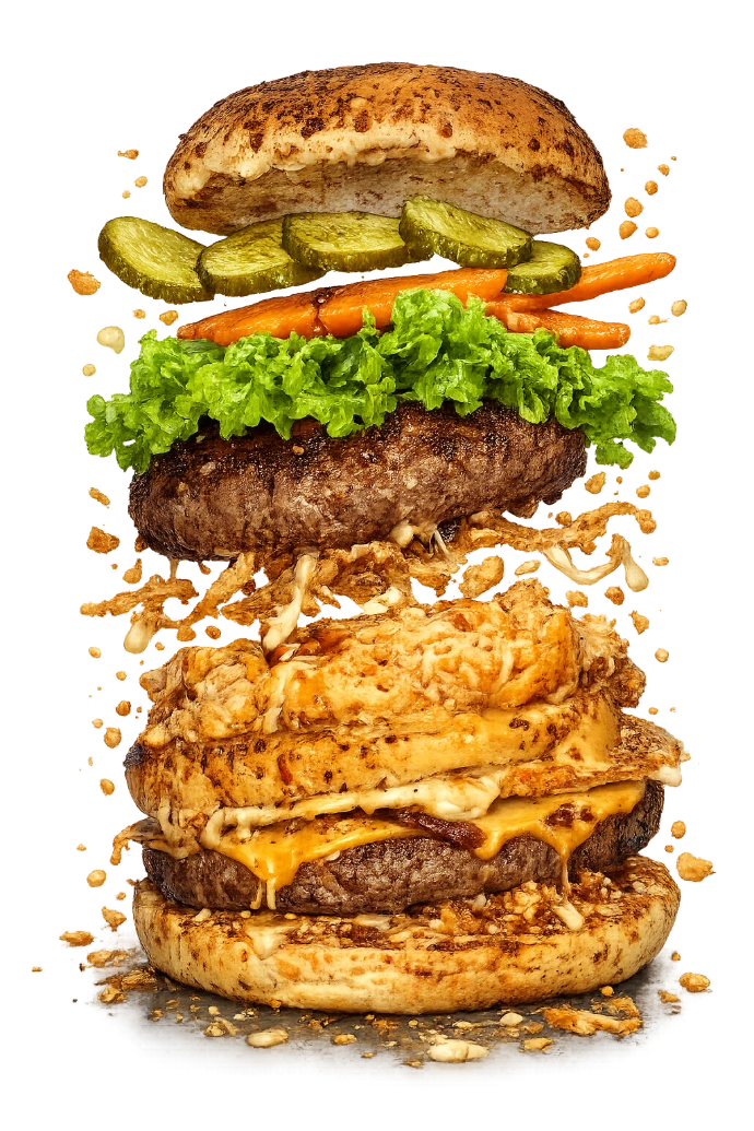 Carne artesanal, bacon, frango, calabresa, cheddar, ovo.